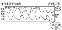 本题解析:本题考查太阳活动的影响。直接读图,黑子相对数较多的年份,年降水量较少;而黑子相对数较少的年份,年降水量较多,故说明两者呈负相关。