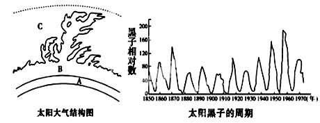 (2)与世界许多地区降水量的所示变化有关的太阳活动是________,它出现在太阳大气的________层(标图中字母)。