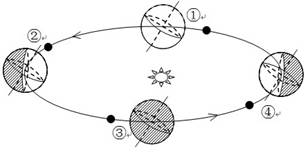 【小题1】根据图示的太阳直射点位置判断,②位置太阳直射点位于北回归线上,故判断为夏至日,④位置太阳直射点位于南回归线上,判断为冬至日;神舟九号发射时为北京时间2012年6月16日,接近夏至日。