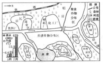 小题1:根据指向标,图中化工厂布局在西部,若布局合理,则主导风向为东风,A错。根据图例,该地气温最冷月小于0度,不适宜种植经济作物甘蔗,B错。根据图中降水量有明显季节变化,所以河流存在明显的夏汛,河流自南向北流,所以有凌汛现象,C对。城市功能区布局也要因地制宜,环境因素对城市地域结构影响较大,D错。