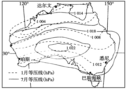 (2)7月时,澳大利亚大陆为冬季,受海陆热力性质差异的影响,陆地上形成高压中心,海洋上形成低压。1月时,澳大利亚大陆为夏季,全球的气压带风带南移,南部位于30°附近受副热带高压控制气压高,而北部相对气压较低。因此海陆热力性质差异和气压带、风带的季节移动是造成澳大利亚大陆7月和1月气压状况不同的原因。