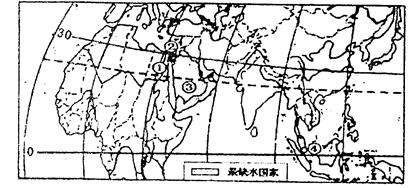 (1)从图中数字①、②、③分布地区看,世界上最缺水的国家中,绝大部分地区的气候特点是 ,其原因主要是受 气压带或 风带控制。(3分)