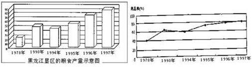 材料三:黑龙江垦区的粮食产量示意图(图1)和粮食的商品率示意图(图2)。