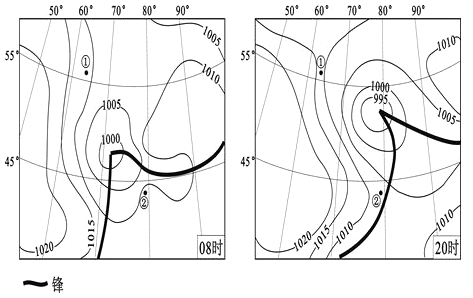 2、单选题 下图是某日08时和20时海平面气压分布图(单位:百帕)。读图,由08时到20时,图中( )