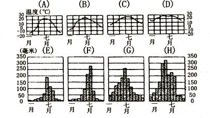 (1)AB图最低月温在0°C以下,判断位于北方地区;CD图最低月温在0°C以上,故判断位于南方地区。结合冬季气温的分布规律:越往北,冬季气温越低;结合各地的降水分布差异,越往南,雨季越长,越往北,雨季越短,故判断哈尔滨为AE;北京为BF;武汉为CG;广州为DH。