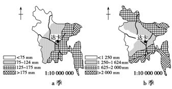 2、单选题 下图为孟加拉国降水量分布图(a季10月~次年3月,b季6~9月)。读图,回答以下问题。