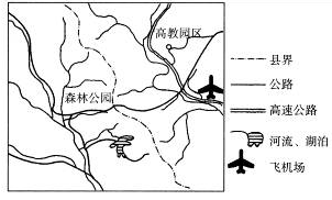 小题3:根据图中注记高教园区,人才资源丰富,有森林公园,环境优美;图例有飞机场和高速公路等高速交通;所以这些企业最有可能为高新技术产业,如电子产品。所以本题选择A选项。