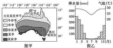 5、单选题 图甲表示澳大利亚不同地区最容易发生火灾的季节,图乙是达尔文市的气候统计图。读图回答下面问题