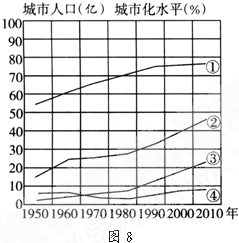 小题3:①为发达国家城市化发展速度慢,②为发展中国家城市化,正处于加速发展阶段;两类国家的城市化发展过程中都可能带来一定的环境问题,D正确。