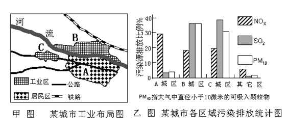 3、单选题 读“某城市工业布局图”和“某城市主要区域污染源排放比例图”,回答下列各题。