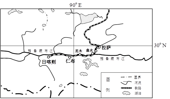 5、单选题 2014年8月16日,青藏铁路的延伸线拉日铁路(拉萨-日喀则)正式通车运营。读拉日铁路略图,完成下列各题。