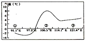 【小题1】根据经纬度,图示经度范围内,30°纬线穿过地区南半球是海洋,北半球是陆地,所以应是北半球。根据经纬度判断,①地位于青藏高原,②地约在四川盆地,③地是长江中下游平原。气温日较差②地比①地小,A错,B对。根据气温值,该月份应是冬季,③地没有伏旱天气,C错。大气逆辐射①地小于②地,D错。