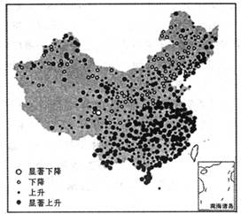 【小题1】读图,根据图例,江淮地区、四川盆地的降水强度显著上升,A、B错。塔里木盆地位于非季风区,C错。只有东北地区降水强度上升或下降幅度小,相对稳定,D对。