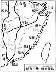 5、填空题 我国正在建设杭州到深圳的沿海铁路,它对东南沿海的发展将起到巨大的作用。如图是“东南沿海铁路图”,读图回答问题。