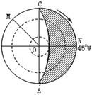 5、综合题 读南极为中心的投影图,下图中最外圈为赤道,虚线表示回归线与极圈,AB代表晨线,OM、ON为日期分界线,∠MOC=450,回答下列问题。(9分)
