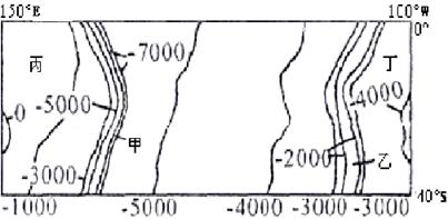 小题1:图经纬线分析图中海域应该为南太平洋海域,甲处等深线密集且最深,应该为海沟,丙处为印度洋板块,甲处以东为太平洋板块,故A、C错。乙处附近等深线密集且海拔高于周围海域,应该为海岭处,乙位于太平洋板块,丁处位于南极洲板块,故C错D正确。