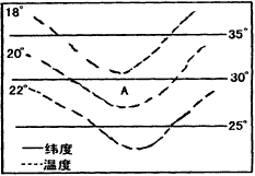 5、综合题 下图中横线表示纬线,曲线表示表层海水等温线,据此,回答问题。
