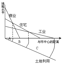 2、综合题 读“各类土地利用付租能力随距离递减示意图”,分析回答问题。