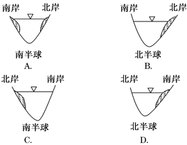 本题解析:地球自转运动产生地转偏向力,其偏向规律是北半球右偏,南半球左偏,赤道上不偏转。河流由西向东流的平直河道,流水在地转偏向力的作用下,在南半球向左偏向流动而侵蚀北岸,堆积南岸,A、C错;在北半球向右偏向流动而侵蚀南岸,堆积北岸,D错,选B。
