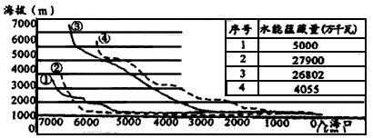 材料二:“长江、黄河、尼罗河和亚马孙河的干流剖面图及流域内水能蕴藏量表”