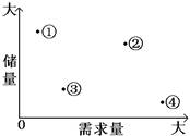 3、单选题 图为某国四地(四地相互之间大体等距离分布)某种重要自然资源储量和需求量关系图。读图,回答题。