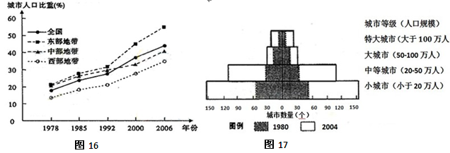 (1)读图16、17,分析改革开放以来我国城市化进程的主要特点。(6分)