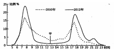 小题2:与2000年相比,2012年甲时段出行比例下降的主要原因是?