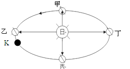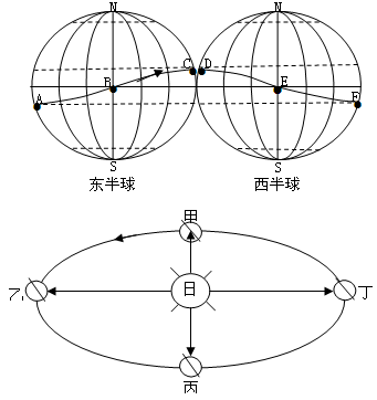(3)下图中地球运行到丙处时,太阳直射点位于上图中的 点附近,其公转速度逐渐(变快、变慢)。(2分)