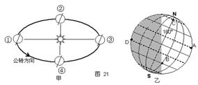 5、综合题 读地球公转中的二分二至图(甲图)和地球光照示意图(乙图,阴影部分为黑夜),回答下列问题。