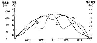 小题1:①②③表示了不同要素的纬度分布规律,根据各要素分布规律可知,气温受太阳辐射的影响较大,其分布是自低纬向高纬递减,如②线所示。就降水而言,赤道地区因终年受赤道低气压带控制,其降水量是全球最多的;到了副热带地区,受副热带高气压带影响显著,形成了一个降水低谷区;而到了南北纬60°附近,由于受极锋的影响,降水又较多;由此可知降水量的分布如图中的③线所示。赤道地区的气温虽然较高,但由于降水丰富,其雪线高度往往低于终年少雨的副热带地区,即雪线高度分布曲线如图的①线所示。故选A。
