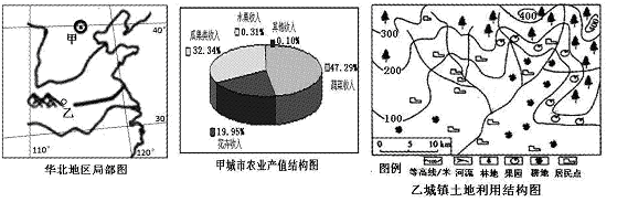 材料一?华北地区局部图,甲城市农业产值结构图和乙城镇土地利用结构图