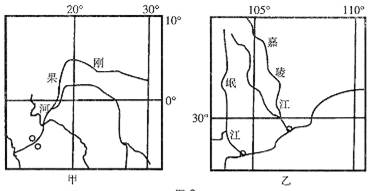小题1:由图中的经纬网和河流名称可知,甲图区域为刚果盆地,乙图区域为四川盆地,甲区实际面积较乙区大,甲区水热条件较乙区优越,甲区土壤为热带雨林条件下发育的砖红壤,其肥力远远低于四川盆地的紫色土,刚果盆地为热带雨林气候,一年四季降水多且均匀,河流径流变化小于亚热带季风条件下的四川盆地。第1题选C。
