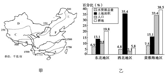 图甲为为我国农业生产潜力分布简图,图乙为某年我国北方地区水资源、土地、人口及耕地占全国总量百分比图。