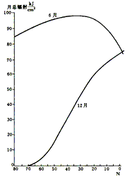 2、综合题 下图是“北半球海平面6月和12月太阳月总辐射量随纬度变化示意图”,读图回答下列问题。