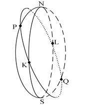 3、单选题 下图中N、S为南北极点,P、Q是晨昏线与某一经线圈的两个交点,K、L位于晨线或昏线的中点,P、K两地经度相差15°。 P点纬度随太阳直射点的移动而变化。据此回答下列问题。