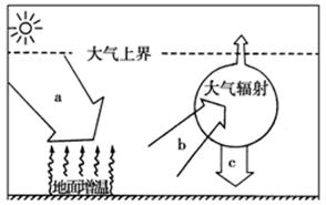 小题1:根据大气受热过程示意图,可判断a为太阳辐射,地面增温,地面进行b地面辐射,大气增幅进行大气辐射,一小部分射向宇宙空间,大部分返还回地面,为c大气逆辐射;太阳辐射是短波辐射,太阳辐射的能量主要集中在可见光区,地面辐射是长波辐射,地面辐射的能量主要集中在红外线,大气主要是吸收红外线,所以大气对太阳辐射吸收比较少,大部分是吸收地面辐射的能量增温,所以大气的直接热源是地面辐射,A错误;大气逆辐射受天气状况影响,一般情况下云层越厚大气逆辐射越强,所以c大气逆辐射与天气状况有关,B错误;臭氧主要是吸收紫外线,而地面辐射的能量主要集中在红外线,所以地面辐射并不是主要被大气中的臭氧吸收;根据物体温度越高,辐射的波长越短,所以a b c所代表的辐射波长的大小关系是a<b<c