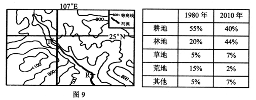 4、单选题 读某河流域等高线地形图9和该流域土地利用结构变化表,回答19~20题。