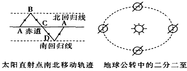 (1)将左图中的A、B、C、D标在右图适当的位置,并注出两至日。