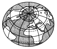 1、单选题 下图所示为以(38°N,0°)为极点的陆地相对集中的“陆半球”(另一半球为“水半球”),读图回答1~2题。