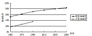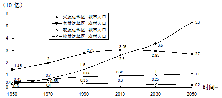 (1)本题是读图能力考查,读图,根据曲线判断,图中欠发达地区农村人口在2010年前增加,之后递减。较发达地区农村人口逐步减少。