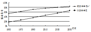 (1)欠发达地区农村人口在2010年前增加(2分),之后递减(2分);较发达地区农村人口逐步减少(2分)。