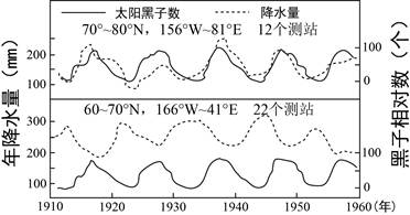 5、单选题 太阳黑子活动的变化会对地球的气候产生明显影响。下图显示北半球部分高纬度地区太阳黑子活动与年均降水量的关系。观测显示,所测地区年平均降水量( )