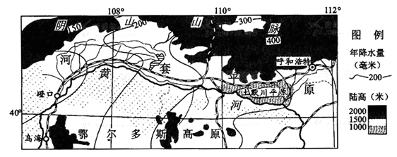 (1)图示主要地形区包含阴山、河套平原、鄂尔多斯高原,所以主要回答阴山、河套平原、鄂尔多斯高原的分布状况。阴山山脉位于北部,呈东西走向;河套平原位于中部,东西延伸;鄂尔多斯高原位于南部,沙漠广布。