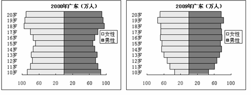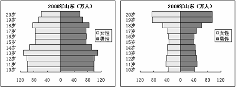 5、单选题 18-20岁是高考适龄人口,从2000年至2008年,全国高考适龄人口持续增加,2009年是中国高考的转折年。图为2000年和2009年10岁至20岁广东省和山东省的人口金字塔图。据图回答下题。