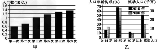 3、单选题 下图中甲是历次我国人口普查总人口数据,乙是我国人口年龄构成和人口流动数据,读图回答问题。