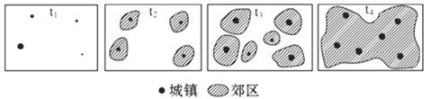 本题解析:首先,通过看图,可以从三个角度来分析:一是从城镇面积大小的变化来看;二是从城镇数目的多少来看;三是从分布的分散与集中程度和城市规模来看。其次,从这个过程中城乡人口比重变化趋势来分析,由城市面积的增加、城镇数目的增多、分布由分散到集中等现象可以推导出,城市人口比重在总人口中的比重不断增加的趋势。?