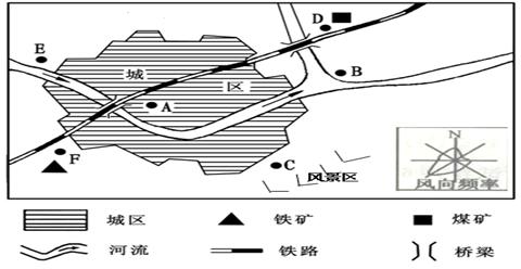 2、综合题 图中某城镇拟规划建钢铁厂、造纸厂、自来水厂、面包厂,疗养院,请在图中A、B、C、D、E、F中选择合适地点,并简要说明理由。(12分)