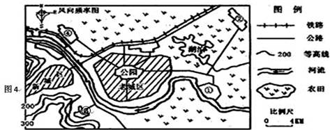 小题1:该市周边①、②、③、④四个卫星城中,最适宜布局化工工业区的是(?)