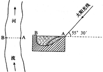 2、单选题 如图为某一河流及其河床AB处的剖面示意图。某地理兴趣小组成员9月23日正午(地方时)在A处观测到的太阳仰角为55°30′,且太阳光线与河岸接近垂直。据此回答问题。
