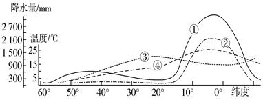 2、单选题 气温、降水量、蒸发量、植物生长量四要素随纬度分布变化示意图,回答下列各题。